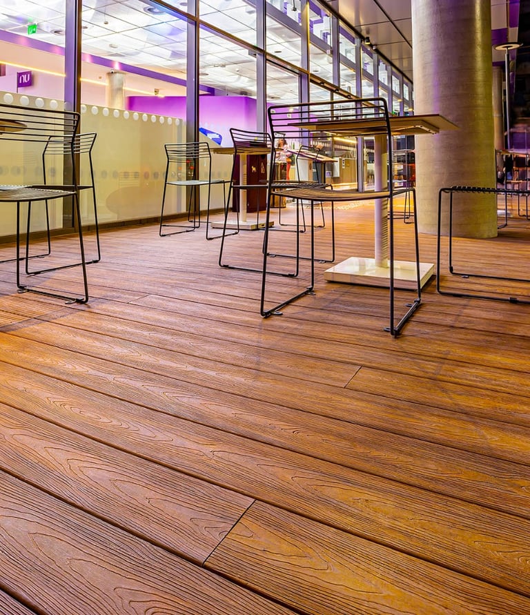 Em áreas de jardim e descompressão, garantindo segurança (não solta farpas e é antiderrapante) e durabilidade.