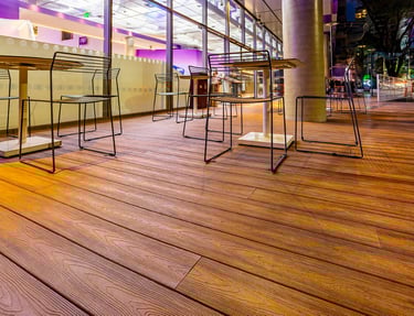 O plástico puro é flexível e deforma-se sob carga ou calor. O nosso composto utiliza fibras de madeira selecionadas que atuam como uma armadura interna. Isso garante que o deck não "encanoe" e suporte o peso de móveis pesados e tráfego intenso, mantendo a sensação sólida de uma tábua de madeira maciça.